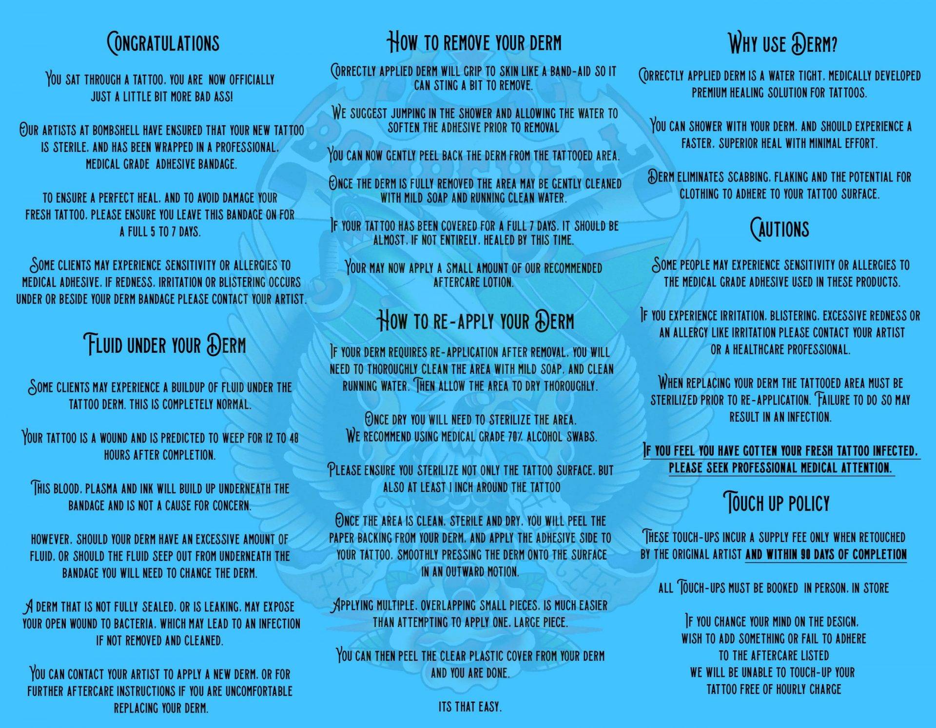 Derm is a protective clear adhesive bandage designed by the medical field for burn and wound care. It is the preferred healing method for tattoos.