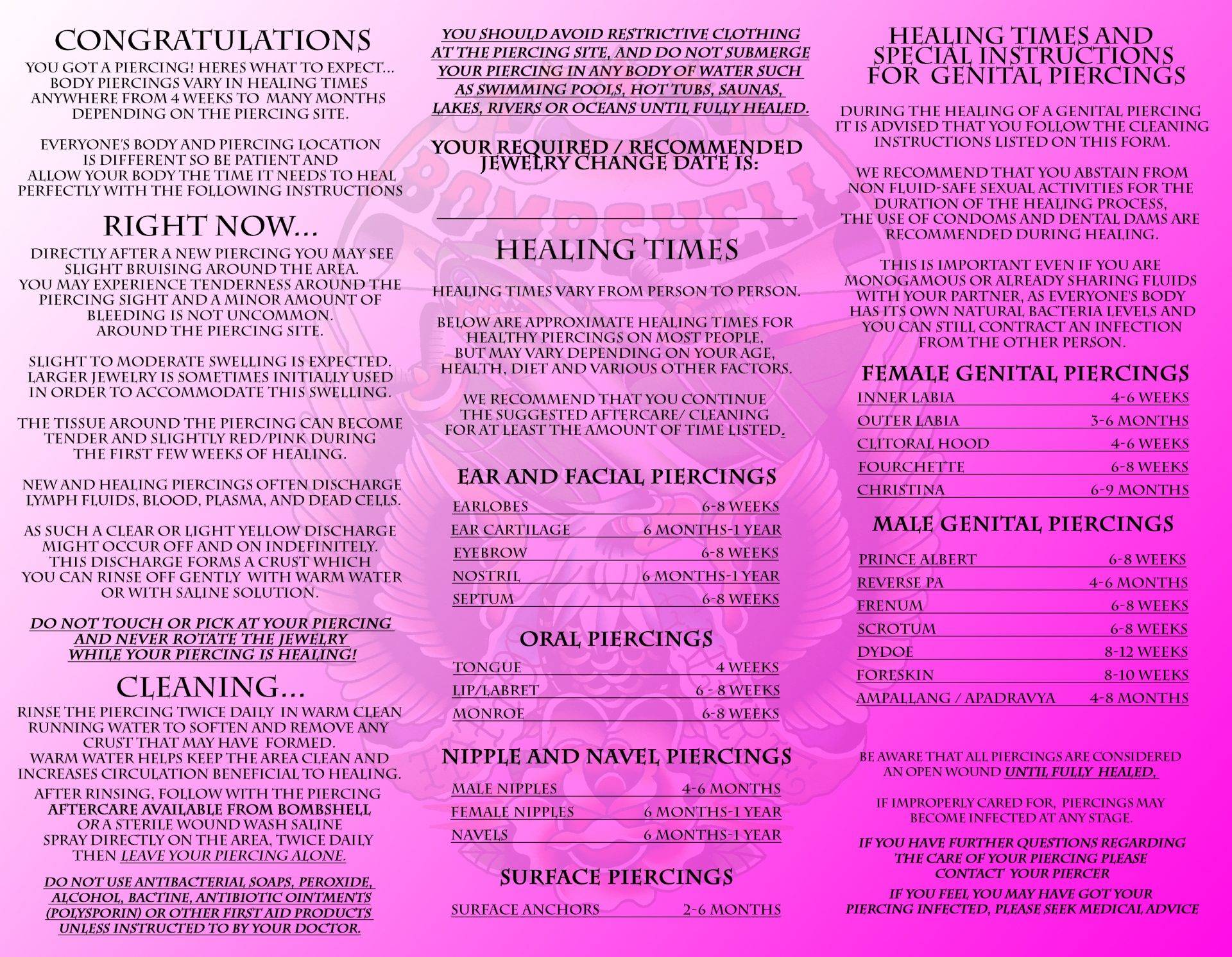 Piercing healing times and methods may vary depending on you anatomy, lifestyle and piercing location.